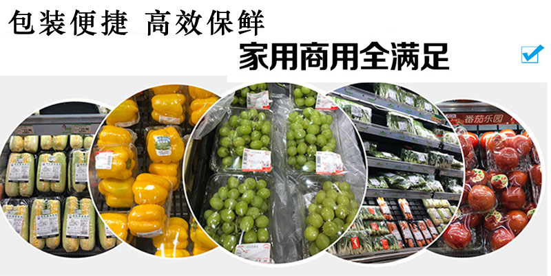 臺式保鮮膜包裝機適用各種保鮮膜(PVC/PO), 建議使用機用PVC膜或機用PO膜,國產進口皆可;部分國外設備只能使用進口保鮮膜。有無托盤均可包裝,且適用于多種形態的托盤(如圓形、六邊形等等)